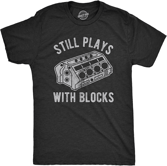 Still Plays With Blocks text from Crazy Dog T-Shirts is perfect for car guys, mechanics, and racing fans who never outgrew their love for engines. Featuring a humorous garage-themed graphic, this men’s tee celebrates working on cars, building engines, and life in the shop. Ideal for gearheads, auto mechanics, racers, and DIY car lovers, it makes a great gift for birthdays, Father’s Day, Christmas, or car enthusiasts who live for the garage. Comfortable and casual, this funny racing t-shirt is perfect for car shows, track days, or everyday wear.